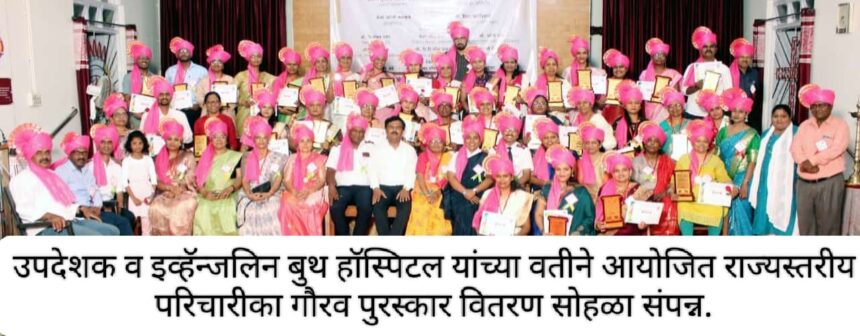 नगर : परिचारीका दिनाचे औचित्य साधून उपदेशक व बुथ हॉस्पिटल अ.नगर यांच्या संयुक्त विद्यमाने परिचारीका गौरव पुरस्कार वितरण सोहळ्याचे आयोजन करण्यात आले होते. सदर कार्यक्रम शर्लि मिलर हॉल बुथ हॉस्पिटल या ठिकाणी संपन्न झाला. सदर कार्यक्रमात महाराष्ट्रातून पन्नासहून अधिक परिचारीकांना परिचारीका गौरव पुरस्कार देऊन सन्मानीत करण्यात आले. कार्यक्रमाच्या अध्यक्षस्थानी श्रीमती सुशिला श्री सुंदर संभाजीनगर या होत्या. व उद्घाटक बुथ हॉस्पिटलचे प्रशासक मेजर देवदान कळकुंबे हे होते. प्रमुख उपस्थितीमध्ये मेजर ज्योती कळकुंबे, सौ. दिक्षा घाटविसावे, मेजर रविंद्र शेलार, ज्योती लोंढे, सौ. छाया जाधव, सौ.टि.टि. पॉल जाधव, सौ. सलोमी जाधव, सौ. मल्लीका साबळे, प्रा. प्रतुल कसोटे, प्रा. गायकवाड मॅडम, कॅप्टन डॅनिसन परमार आदि मान्यवर उपस्थीत होतेकार्यक्रमाची सुरूवात प्रार्थनेने व दिप प्रज्वलन करून झाली. प्रास्ताविक श्री जॉर्ज क्षेत्रे यांनी केले. सर्व मान्यवरांनी परिचारीका दिनानिमित्त मोलाचे मार्गदर्शन करून पुरस्कार प्राप्त परिचारीकेंना शुभेच्छा दिल्या व उपदेशकाच्या कार्याचे कौतुक केले. यावेळी बुथ हॉस्पिटल नर्सिंग कॉलेजच्या विद्यार्थीनींनी गित व नृत्य सादर केले. कार्यक्रमाचे सुत्रसंचालन कुमारी स्नेहल सुर्यवंशी यांनी केले. तर आभार विक्रम गायकवाड यांनी मानले. शेवटची प्रार्थना प्रकाश लोखंडे यांनी केली. कार्यक्रम यशस्वीरित्या पार पाडण्याकरिता प्रवीण साबळे, शितल शिंदे, जयमाला केदारी, कविता गायकवाड आदिंनी परिश्रम घेतले.